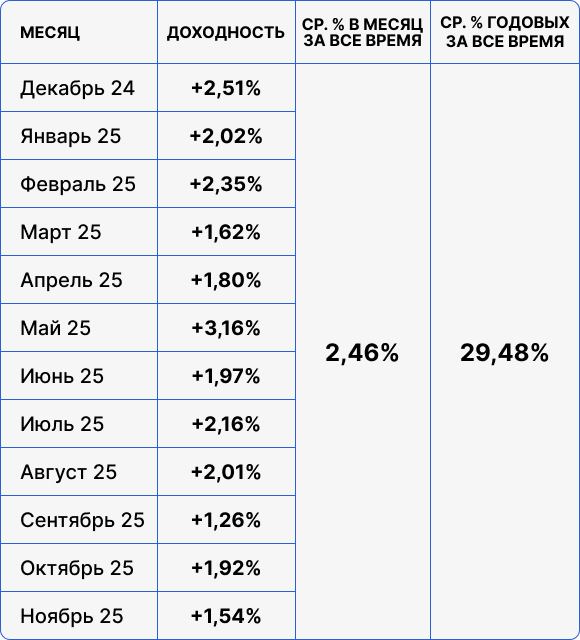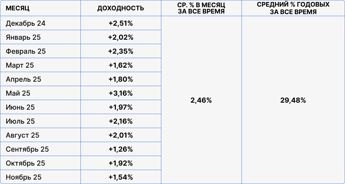 Это означает, что по завершении 12-месячного инвестиционного цикла инвестор получает обратно 100% вложенной суммы. Возврат осуществляется в течение 3 месяцев после заявки на вывод. Доход начисляется отдельно — ежемесячно, в виде дивидендов.