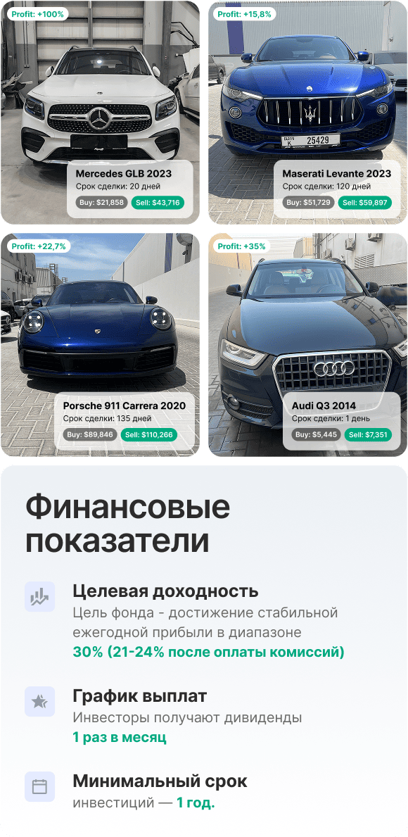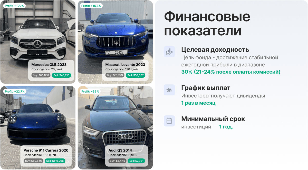 Фонд инвестирует в автомобили для последующей аренды. Машины сдаем через собственный сервис Autotrade.ae, что укрепляет наши позиции на рынке аренды в Дубае.