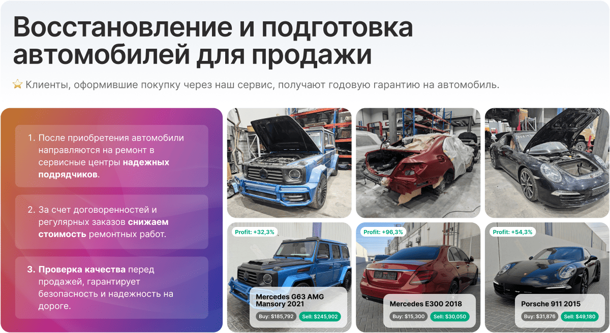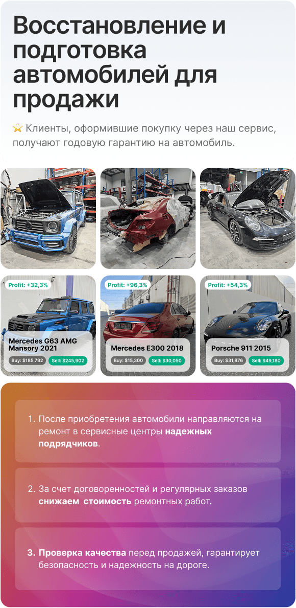 Фонд покупает автомобили с незначительными повреждениями на аукционах на 20-30% дешевле рыночной стоимости, проводит их ремонт и реализует по более высокой цене. Благодаря сотрудничеству с сертифицированными автомеханиками и профессиональными сервисными центрами, мы достигаем максимальной доходности при перепродаже.