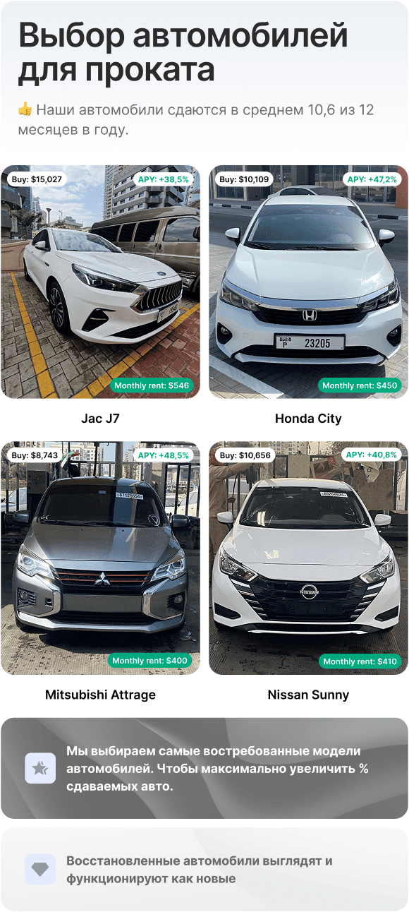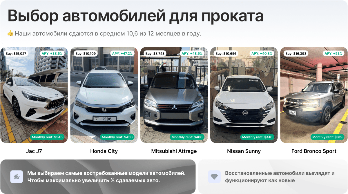- Доходность и гибкие условия: Мы предлагаем доходность до 35% годовых с ежемесячными дивидендами, гибкие условия входа от $1,000 и возможность реинвестирования. Сочетание аренды и продаж снижает риски, а ликвидность автомобилей обеспечивает стабильный спрос.
