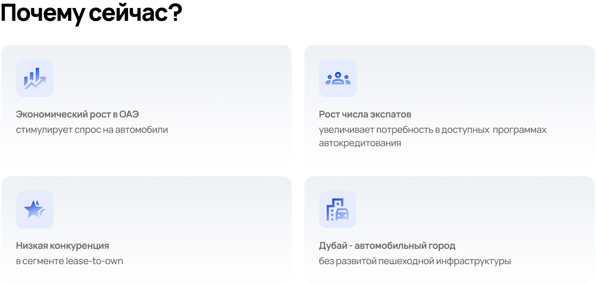 Мы привлекаем инвестиции в бизнес по продаже б/у автомобилей в лизинг в ОАЭ.