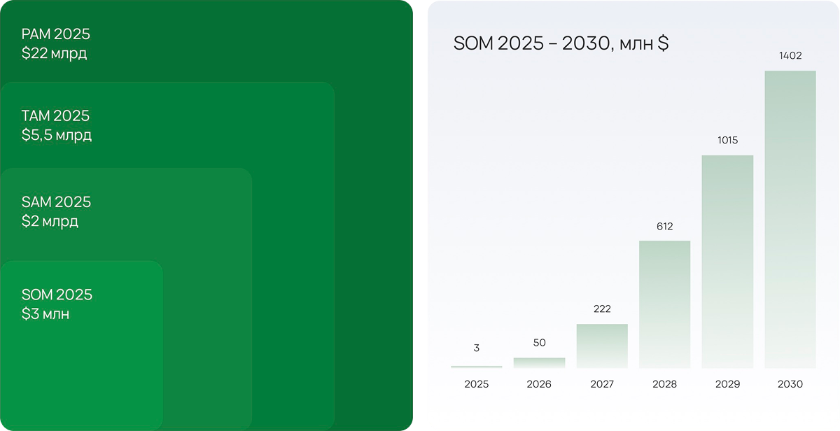 С учётом среднегодового темпа роста рынка CAGR равного 10,5% с 2024 по 2030 год, а также роста доли рынка компании Regolith Leasing, достижимый объём рынка SOM составит $1,4 млрд.