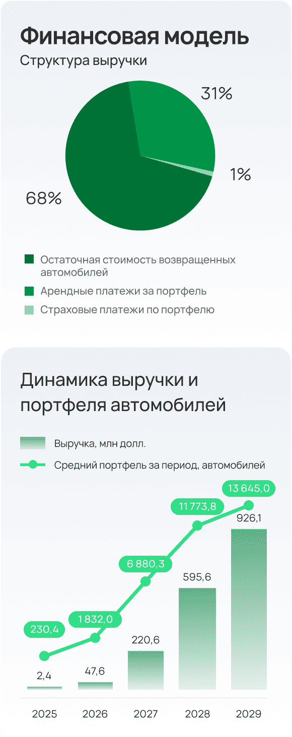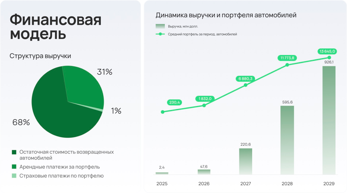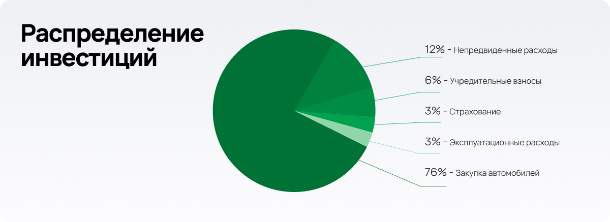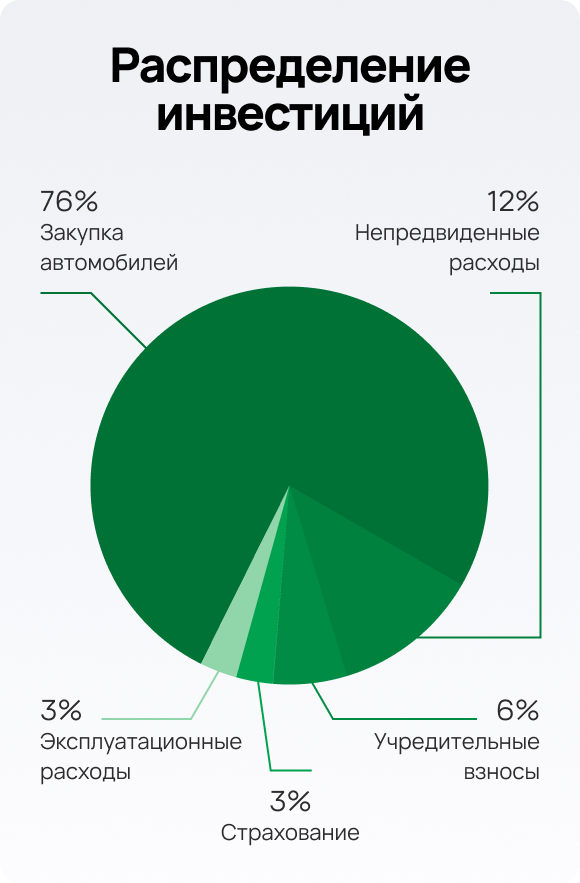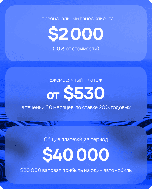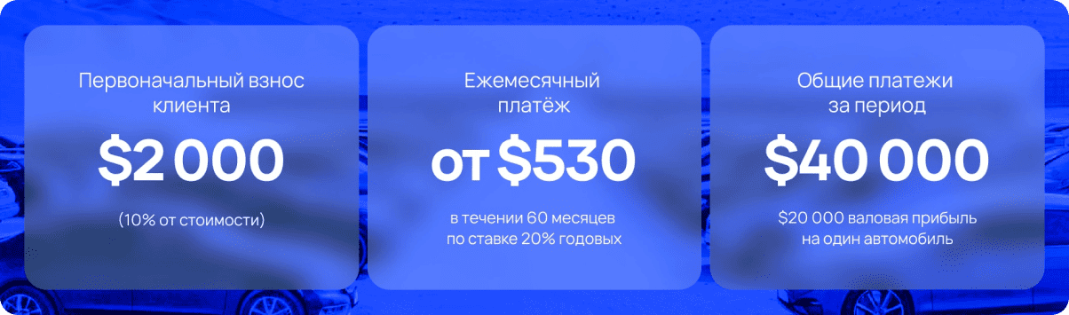 Клиенты берут авто в аренду с выкупом. Они вносят аванс и затем ежемесячно выплачивают остаток стоимости с 20% годовых. Эти платежи — источник дохода фонда.
