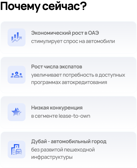 Возможности рынка: Устранение пробела в финансировании покупки транспортных средств для людей со средним и низким уровнем дохода, которые не могут получить кредит в банках.