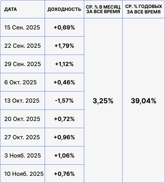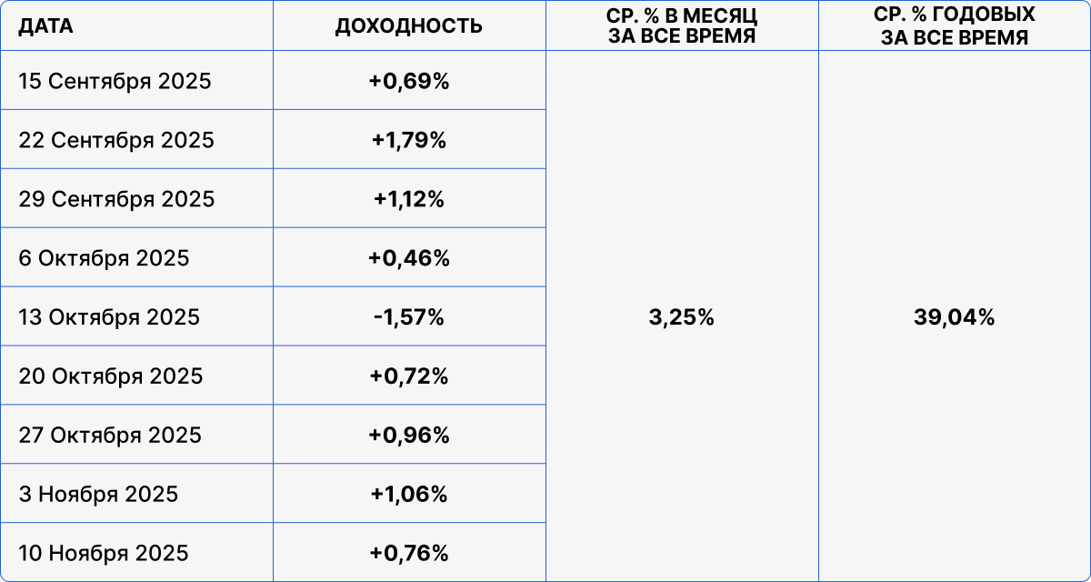 Целевая доходность составляет 6–10% в месяц. Дивиденды начисляются еженедельно, что обеспечивает высокую ликвидность.