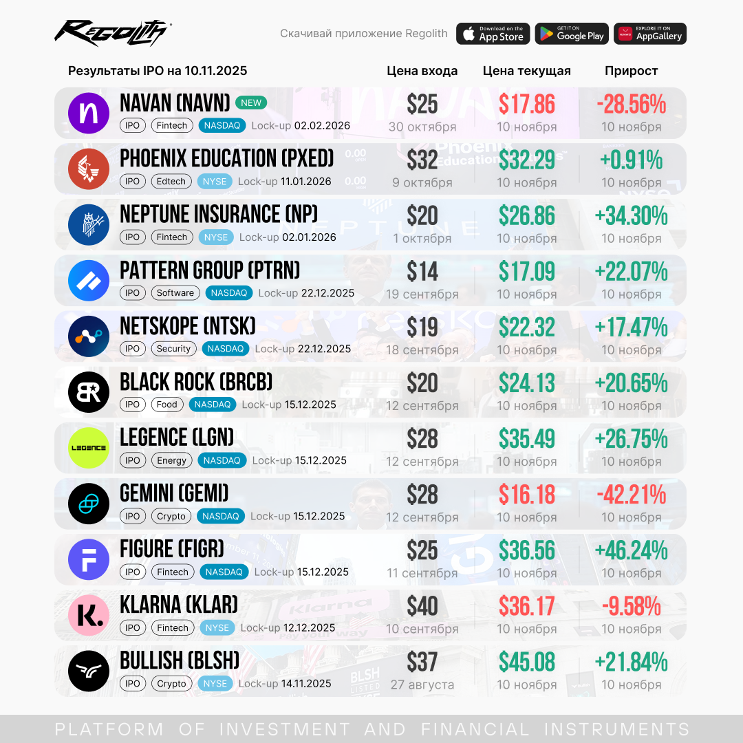 Regolith продолжает следить за динамикой компаний, в IPO которых участвуют наши инвесторы, и регулярно публикует аналитические обзоры, данные о доходности и рыночные инсайты.