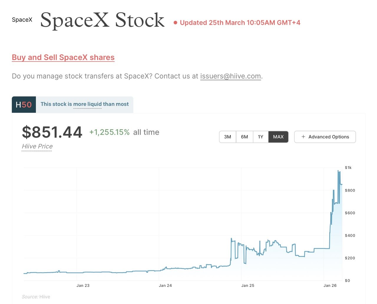 Цены на акции SpaceX на закрытых площадках показывают реальный спрос инвесторов еще до официального IPO. По данным платформы Hiive, на 25 марта акции SpaceX торгуются в районе $851.